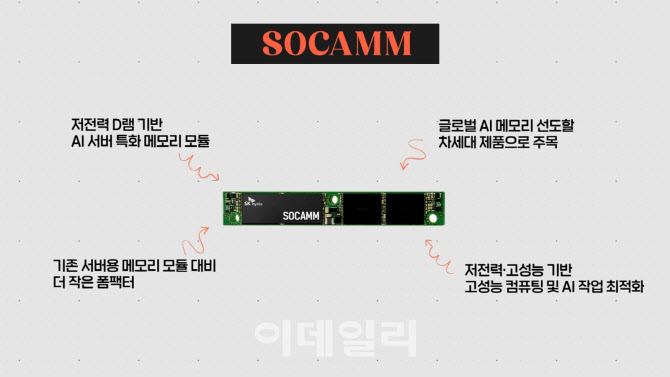 소캠은 차세대 저전력 메모리 모듈으로, 제2의 HBM으로 불린다. 기존 서버용 메모리 모듈보다는 더 작은 폼팩터를 가지면서 전력 효율은 높은 저전력 D램 기반의 AI 서버에 특화한 메모리 모듈이다. 소캠은 엔비디아가 AI 메모리 반도체 시장 주도권을 강화하고자 독자 표준을 추진 중인 제품이다. 기존 DDR D램이 아닌 LPDDR을 묶어 탑재한다.
