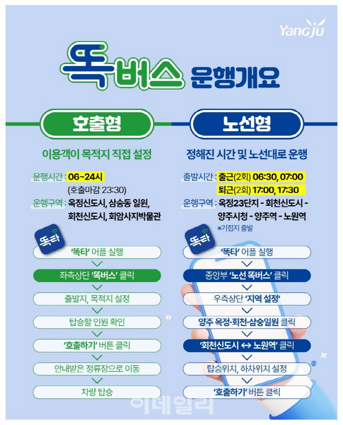 경기 양주시는 똑버스 5대를 추가 도입해 오는 20일부터 회천신도시와 회암사지박물관을 비롯 지하철 4·7호선 환승이 가능한 서울 노원역까지 노선을 확대한다고 12일 밝혔다.