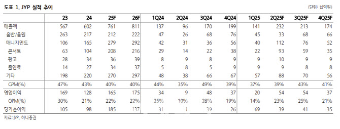 올 1분기 비용 관련해서는 킥플립 데뷔와 ‘더딴따라’ 제작비 관련 17억원이, 영업외로는 디어유 매각 차익 약 740억원이 반영됐다. 블루개러지는 1분기 소폭 손실을 기록했지만, 오프라인 팝업을 대폭 축소하고 스트레이키즈와 다마고치의 콜라보 기획상품(MD) 등을 통해 수익성을 강화하고 있다는 분석이다.
