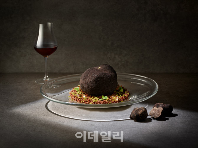 이번 디저트는 블랙 트러플을 컨셉으로, 블랙 트러플의 모습과 질감을 그대로 재현했다. 숲속의 흙을 쿠키 크럼블로, 푸릇한 풀을 허브로 재현해 땅 속 트러플의 모습을 표현했다.