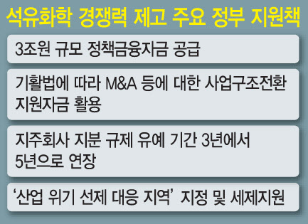 대신 정부는 기업들이 사업 재편 계획을 전달하면 이를 정책으로 지원사격한다는 계획이다. 석유화학 기업들은 산업용 전기요금 감면 및 연구개발(R&D) 시설 세액공제 등을 요구하고 있다. 앞서 정부는 지난해 12월 ‘석유화학산업 경쟁력 제고 방안’을 발표하며 △3조원 규모의 정책금융 지원 △지주사 지분 규제 유예 기간 3년→5년 확대 △산업 위기 선제 대응 지역 지정 등의 지원을 하겠다고 밝힌 바 있다. 이에 따른 첫 번째 지원책으로 정부는 이달 초 지역 경제 위기가 우려되는 전남 여수시를 2년간 산업 위기 우려 지역으로 우선 지정한다고 밝혔다. 여수산업단지에는 LG화학·롯데케미칼·금호석유화학·한화솔루션 등 4대 석유화학 업체 등 석화 기업들이 밀집한 지역이다.