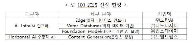 1일 중기부에 따르면 세계 AI 시장에서 가장 권위 있는 기업평가기관 중에 하나로 꼽히는 CB 인사이츠(Insights)의 ‘AI 100 2025’(글로벌 AI 100대 기업)에 노타AI, 디노티시아, 업스테이지, 트웰브랩스 등 4개 국내 AI 스타트업이 포함됐다. CB 인사이츠는 세계적인 데이터베이스를 기반으로 한 비즈니스 분석 플랫폼을 통해 기업과 투자자 활동에 대한 시장 정보를 제공하는 민간기업이다. 매년 전세계 비상장 AI 기업을 대상으로 사업 성과, 기술력, 투자 현황 등을 종합 평가해 글로벌 AI 시장을 선도할 100개 AI 기업을 선정하고 있다.