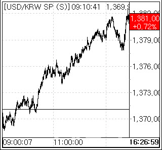 이날 환율은 역외 환율을 반영해 전 거래일 종가보다 4.9원 내린 1371.0원에 개장했다. 이날 환율은 우상향 흐름을 보였다. 개장 직후 1368.6원을 터치한 이후 환율은 꾸준히 상승했다. 점심 무렵에 환율은 상승 전환됐고, 장 마감 때까지 1380원을 등락하다 마감했다.