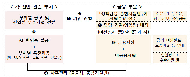 정책금융기관들은 ‘혁신 프리미어’ 전용상품 신설 등을 통해 정책금융기관의 상품 중 최고 수준의 우대(금리, 대출한도, 보증비율 등)를 제공한다. 또 기업의 성장 단계, 산업 특성, 투자 수요 등을 감안하여 컨설팅·IR·수출지원 등 폭넓은 비금융지원도 실시할 예정이다.