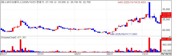 HansBiomed jumped 16.35% to 33,800 won, hitting an intraday 52-week high of 35,800 won. The stock has leapt 46.96% since Oct. 20, driven by early traction for its extracellular matrix (ECM)–based skin booster.