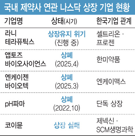 이밖에도 단독으로 나스닥 상장을 추진한 국내 바이오 스타트업인 pH파마는 2022년 상장 후 4개월 만에 상폐됐고, 제넥신(095700)과 에스씨엠생명과학(298060)이 설립한 코이뮨(CoImmune)은 상장 실패 후 자금난으로 사실상 사업을 접었다. 대부분 매출이 거의 없는 임상단계 기업이었다.