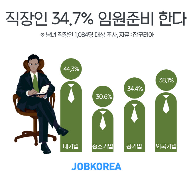잡코리아가 남녀직장인 1084명을 대상으로 설문조사를 진행한 결과, 현재 임원이 되기 위해 준비하고 있는 직장인은 34.7%로 집계됐다. 이는 2017년 조사 당시 41.1% 보다 6.4%P 낮아진 수치이다.