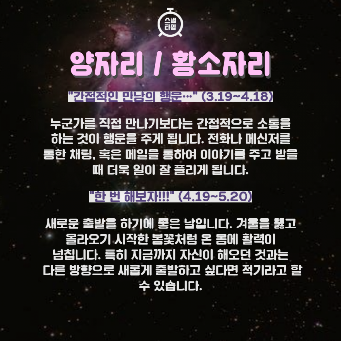 새로운 출발을 하기에 좋은 날입니다. 겨울을 뚫고 올라오기 시작한 봄꽃처럼 온 몸에 활력이 넘칩니다. 특히 지금까지 자신이 해오던 것과는 다른 방향으로 새롭게 출발하고 싶다면 적기라고 할 수 있습니다.