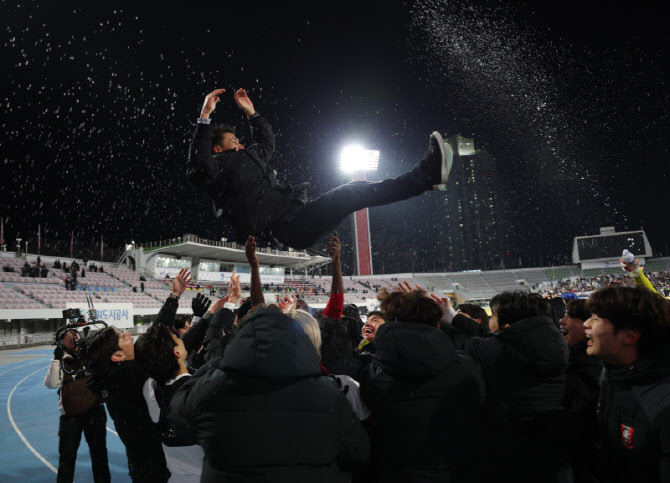 | | 8일 수원종합운동장에서 열린 프로축구 승강 플레이오프 2차전 수원FC와 부천FC의 경기. 3대2로 승리한 부천FC 선수들이 이영민 감독을 헹가래하고 있다. 사진=연합뉴스 |