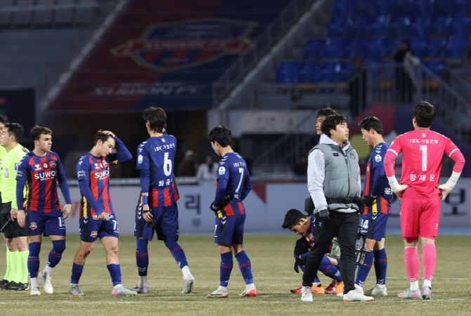 | | 8일 수원종합운동장에서 열린 프로축구 승강 플레이오프 2차전 수원FC와 부천FC의 경기. 2대3으로 지며 K리그2 강등이 확정된 수원FC 선수들이 아쉬워하고 있다. 사진=연합뉴스 |