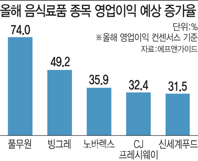 금융정보업체 에프앤가이드에 따르면 음식료 업종의 올해 영업이익 컨센서스 평균 증가율은 27.5%로 집계됐다. 추정기관 수 3곳 이상인 종목 중에서는 풀무원(017810)이 74%로 가장 높았으며 △빙그레(005180)(49.2%) △노바렉스(194700)(35.9%) △CJ프레시웨이(051500)(32.4%) △신세계푸드(031440)(31.5%) △농심(004370)(29%) 순이었다.