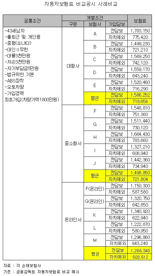 금감원이 제시한 차보험료 비교 사례조건은 ▲43세 남자 ▲출퇴근 및 개인용 ▲중형(쏘나타) ▲대인Ⅱ무한 ▲대물 3000만원 ▲자손 3000만원 ▲자기부담금 5만원 ▲법규위반 기본 ▲ABS장착 ▲오토차량 ▲최초가입(차량가액 1800만원)이다.