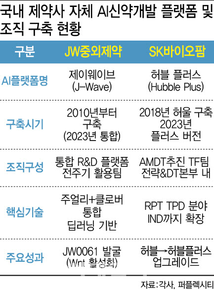 이런 흐름속에 국내에서도 일부 기업은 이미 자체 플랫폼 체제로 전환했다. 국내에서는 JW중외제약(001060)과 SK바이오팜(326030)이 자체 AI 플랫폼 구축에 가장 적극적이다. JW중외제약은 AI 기반 신약 R&D 통합 플랫폼 ‘제이웨이브(J-Wave)’를 운영하고 있다. 이 플랫폼은 2010년부터 구축해온 빅데이터 기반 약물 탐색 시스템 ‘주얼리’와 ‘클로버’를 통합해 AI 모델 적용 범위를 대폭 확장한 것이다.