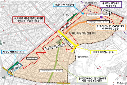 서교동 395번지 일대에는 디자인과 출판산업을 집중 육성하는 마포 디자인·출판지구가 만들어진다. 서울시와 마포구는 경영컨설팅, 디자인 개발 등 지원사업을 펼칠 수 있도록 올해 4억5000만원을 투자, 소규모 앵커시설을 설치한다. 이 시설은 2015년 경의선 부지에 들어설 홍대복합역사에 다시 확장·이전할 계획이다.