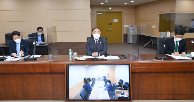 홍 부총리는 문재인 정부 출범 4주년을 맞은 이날 확대 간부회의를 열고 “대통령이 올해 4% 이상 성장률을 달성토록 정부 역량을 총동원하겠다고 한 만큼 후속 조치를 신속히 추진할 필요가 있다”며 “방역 안정을 감안한 내수진작책, 일자리 회복대책, 민생안정 대책 등이 탄탄하게 반영되도록 준비해달라”고 당부했다.