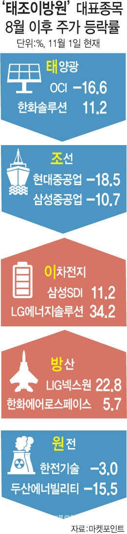다만 증권가에서는 태조이방원 테마의 지속성에 대해서 부정적으로 보는 의견이 우세하다. 이정빈 신한투자증권 연구원은 “이차전지와 방산 외에 실적과 같이 펀더멘털이 받쳐주는 업종이 없다고 본다”면서 “태조이방원 테마에서 살아남은 신재생 에너지 등 이익 가시성이 있는 업종을 선별해서 봐야 한다”고 조언했다.