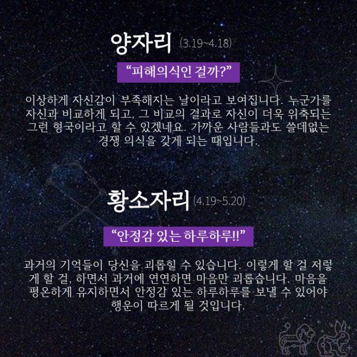 이상하게 자신감이 부족해지는 날이라고 보여집니다. 누군가를 자신과 비교하게 되고, 그 비교의 결과로 자신이 더욱 위축되는 그런 형국이라고 할 수 있겠네요. 가까운 사람들과도 쓸데없는 경쟁 의식을 갖게 되는 때입니다.