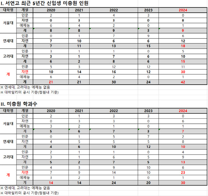 서울대의 자연계 미충원 인원은 2020학년도에 단 한 명도 없었지만 2021년과 2022년에 각각 3명씩 발생했다가 2023학년도에 다시 0명으로 감소했지만 2024학년도에 8명으로 급증했다. 연세대는 2020학년도 7명에서 2023학년도 6명, 2024학년도 12명으로, 고려대도 2020학년도 3명에서 2023학년도 6명, 2024학년도 10명으로 증가세를 보였다.