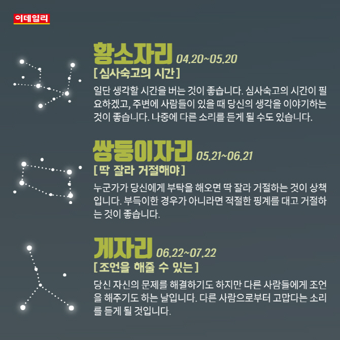 △황소자리 : 일단 생각할 시간을 버는 것이 좋습니다. 그 자리에서 선택을 해주면 나중에 딴 소리를 듣게 될 수도 있습니다. 심사숙고의 시간이 필요하겠고, 주변에 사람들이 있을 때 당신의 생각을 이야기하는 것이 좋습니다. 나중에 다른 소리를 듣게 될 수도 있습니다.
