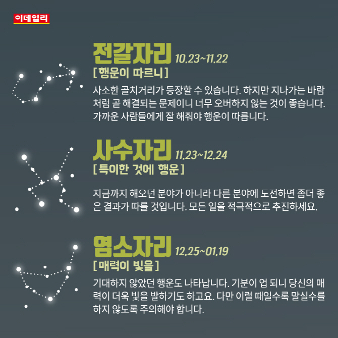 △염소자리 : 기대하지 않았던 행운도 나타납니다. 기분이 업 되니 당신의 매력이 더욱 빛을 발하기도 하고요. 다만 이럴 때일수록 말실수를 하지 않도록 주의해야 합니다. 기분 탓에 쉽게 말을 하게 될 수 있습니다.