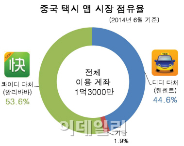 파이낸셜타임스(FT)는 중국 IT조사기관 이관궈지(易觀國際) 조사를 인용해 올 상반기 두 기업이 택시 앱 개발에 투자한 비용이 20억위안(약 3314억원)에 달했으며 시장점유율을 절반 차지하는 것으로 전쟁이 마무리됐다고 17일(현지시간) 보도했다.
