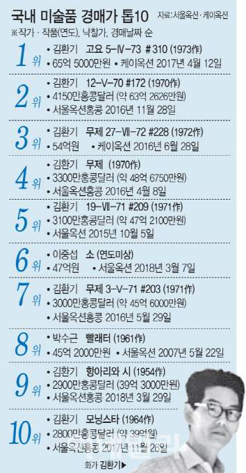 현재 ‘국내 미술품경매 최고가’ 1∼5위는 ‘고요 5-Ⅳ-73 #310’을 비롯해 여전히 김환기의 전면점화 5점이 싹쓸이 중이다. ‘12-Ⅴ-70 #172’(1970·63억 2626만원), ‘무제 27-Ⅶ-72 #228’(1972·54억원), ‘무제’(1970·48억 6750만원), ‘19-Ⅶ-71 #209’(1971·47억 2100만원)의 순. 하지만 6~10위는 한 점을 제외하곤 반추상·구상화에 양보했다. 이중섭의 ‘소’, 김환기의 ‘무제 3-V-71 #203’(1971·45억 6000만원)에 이어 박수근의 ‘빨래터’(1961·45억 2000만원), 김환기의 ‘항아리와 시’와 ‘모닝스타’ 등이 차례로 이름을 올렸다.
