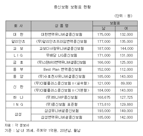 이밖에 교보생명(남 18만7000원·여 14만4000원)과 대한생명(남 17만5000원·여 13만2000원)등 대형생보사들의 보험료도 다소 비싼 것으로 조사됐다.
