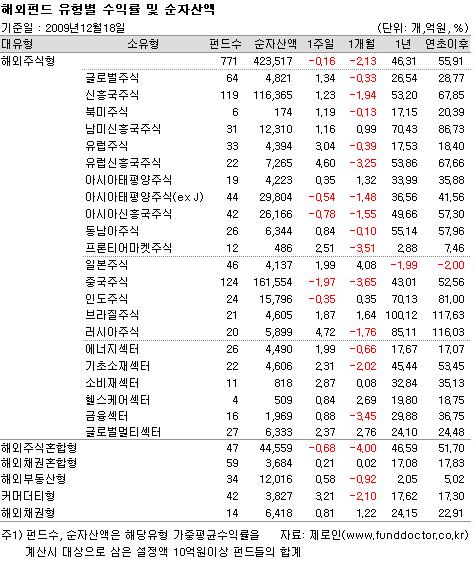반면 중국주식펀드는 -1.97% 수익률을 보였다. 두바이 사태 진정에 글로벌 증시 상승에도 불구하고 중국정부의 부동산 및 대출 규제 움직임에 금융, 부동산주에 매물이 집중됐다. 또한 주중 예정된 10개 기업의 IPO와 차스닥 2차 기업공개 일정도 심리적 부담으로 작용했다.