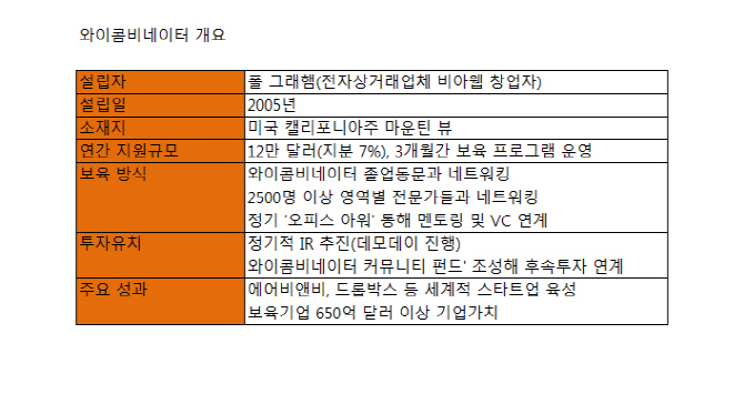 와이콤비네이터는 지난 2005년 컴퓨터공학 박사이자 전자상거래 솔루션업체 ‘비아웹’(Viaweb)을 창업한 폴 그래햄이 설립했다. 그래햄은 엔젤투자와 창업보육이 결합된 형태를 처음으로 시도, 전 세계에 액셀러레이터를 전파했다. 액셀러레이터 정보제공사이트 시드 디비에 따르면 와이콤비네이터는 지난해까지 1173개 기업에 총 118억6900만달러(약 12조8000억원)를 투자했다. 투자 회수 금액도 36억5400만달러(약 3조9500억원)에 달한다.