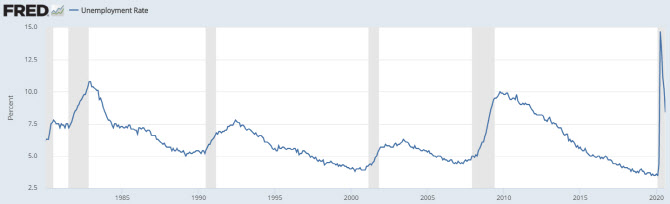 그러나 환호는 이르다는 평가가 적지 않다. 지금까지 미국의 최악 고용난은 1980년대 초 오일쇼크 때다. 1982년 9월~1983년 6월 총 10개월간 두자릿수 실업률을 보였다. 최고치 기록은 1982년 11월과 12월 각각 10.8%. 이번 팬데믹발(發) 실업 대란이 오일쇼크 때보다 짧지만 강렬하다는 해석이 가능하다. 10여년 전 글로벌 금융위기 당시에는 2009년 10월 한달만 10.0%로 두자릿수 실업률을 나타냈을 뿐이다.