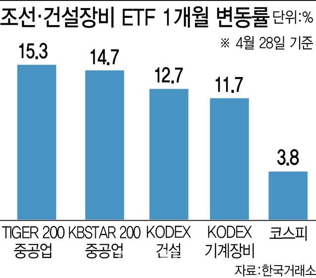 1일 한국거래소에 따르면 지난달 28일 기준 ‘TIGER 200 중공업’ 은 1개월간 15.33%, ‘KBSTAR 200 중공업’은 14.74%의 수익률을 기록했다. 같은 기간 코스피 지수(3.83%)를 훌쩍 웃도는 수준이다.