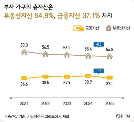 KB금융이 개인 심층인터뷰한 부자(400명)로 한정하면 총자산 포트폴리오에서는 부동산자산의 비중이 줄고 기타자산 비중이 늘어나는 변화도 나타났다. 부동산자산 비중은 2011년 58.1%에서 2021년 59.0% 등으로 10년 간 높은 비중을 차지했지만, 코로나19 팬데믹 이후 2022년(56.5%)부터 하락하며 2025년에는 54.8%로 낮아졌다. 금융자산은 투자 비중에 큰 변화가 없었지만, 기타자산은 최근 금·보석 등 실물자산과 암호화폐 등 가상자산에 대한 투자가 늘며 포트폴리오에서 차지하는 비중이 높아졌다.