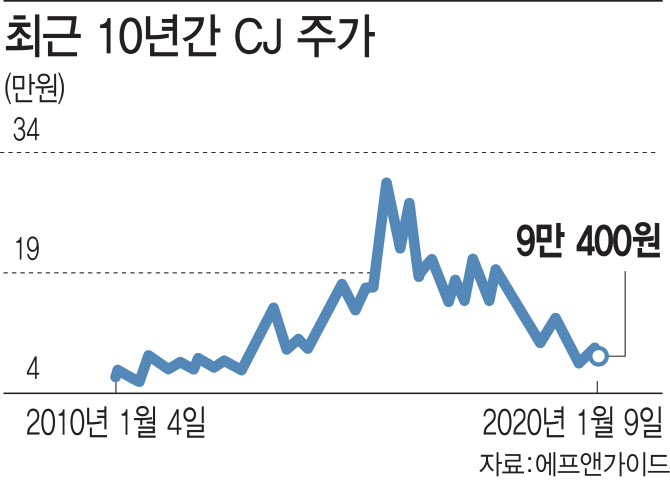 실제 CJ 주가(수정주가 기준)는 2015년 8월 30만5521원을 고점으로 5년 연속 하향세를 그리고 있다.