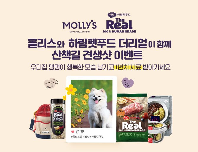 7월 7일까지 SNS에 게시글을 올린 고객 중 ‘좋아요’ 투표로 36명을 선정해 최다 득표자 1명에게는 하림펫푸드 ‘더리얼’ 사료 1년치, 2위부터 6위까지 5명에게는 ‘더리얼’ 사료와 간식세트, 7위부터 36위까지 30명에게는 ‘더리얼&더미식 유니자장 세트’를 증정한다. 또한 참여자 10명을 무작위로 선정해 삼성카드가 만든 ‘삼성 iD PET 카드’ 반려동물 산책가방 제공한다.