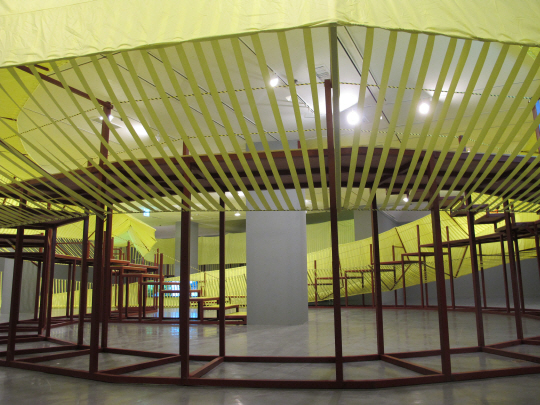 구동희(41) 작가는 ‘재생길’이란 제목으로 전시를 꾸몄다. 장방형 대칭구조인 전시장에 36개의 모듈로 270도가 기울어진 뫼비우스의 띠 형태의 길이 75m짜리 구조물을 설치했다. 관람객은 안전동의서에 사인을 하고 안전모를 쓰면 구조물 안으로 들어갈 수 있다. 작가는 미술관 옆 놀이동산의 롤러코스터에서 작품의 영감을 받았다고 한다. 구조물 곳곳에는 롤러코스터를 타는 관람객의 시점으로 촬영한 영상이 설치됐다. 구조물의 끝에는 점프를 할 수 있는 트램플린이 설치됐다. 시작과 끝을 알 수 없는 순환계에서 탈출할 수 있는 방법은 두려움을 감내하고 뛰어내리는 것이다.