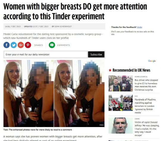 보도에 따르면 연구팀은 칼라라는 여성에게 ‘원래의 사진’과 ‘포토샵으로 가슴을 키운 사진’을 각각 프로필로 지정해 데이트 애플리케이션 틴더에 가입하게 했다.