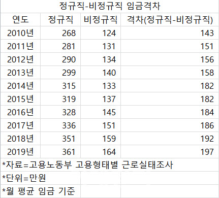 정규직 근로자와 비정규직 근로자 간 임금 격차는 계속 증가해 △2015년 182만2000원 △2016년 183만8000원 △2017년 185만7000원 △2018년 192만2000원에 이어 지난해에는 지난해 196만9000원으로 벌어졌다.
