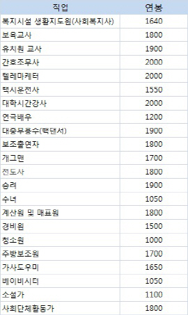 사회서비스직군도 저임금에 시달리고 있다. 복지시설 생활지도원(사회복지사)는 연봉이 1640만원, 보육교사는 1800만원, 유치원교사는 1900만원, 간호조무사는 2000만원 수준이었다. 이들 직업군에 속한 직장인들은 맞벌이가 아닌 이상, 정상적인 가정을 꾸려 유지해 나가는 게 쉽지 않다는 얘기다.