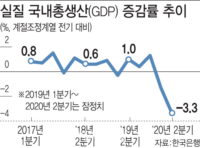 23일 한국은행이 발표한 ‘2020년 2분기 GDP(속보치)에 따르면 2분기 실질 GDP는 전기대비 -3.3%를 기록했다. 지난 1998년 1분기 -6.8%를 기록한 이후 22년만에 최저다. 올 1분기 -1.3%보다 더 악화했다. 실질 GDP 성장률이 연속 2개 분기 이상 역성장한 것은 역대 네 번째다. 이전에는 2차 오일쇼크 당시인 1979년 3~4분기와 외환위기 때인 1998년 1~3분기, 카드대란이 터졌던 2003년 1~2분기 뿐이다.