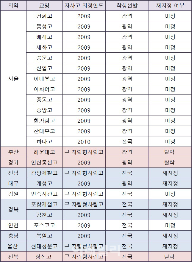 원조 자사고에 해당하는 현대청운고·민족사관고·광양제철고·포항제철고·상산고는 자율형사립고가 도입된 뒤에도 지역에 관계없이 학생 선발이 가능한 ‘전국단위 자사고’로 남았다. 반면 해운대고는 2009년에 부산지역에서만 신입생을 뽑는 광역단위 자사고로 전환했다.