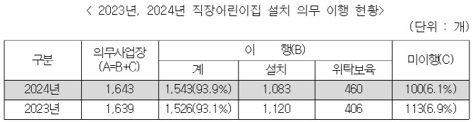 자료에 따르면, 2024년 기준 실태조사 결과 설치 의무 대상 사업장 1643개 중 1543개소(93.9%)가 직장어린이집을 설치하거나 위탁보육을 실시해 이행률은 전년 대비 0.8%포인트 상승했다. 이중 1083개소는 직장어린이집을 직접 설치했고, 460개소는 외부 어린이집과 계약을 맺고 위탁보육 형태로 지원했다.