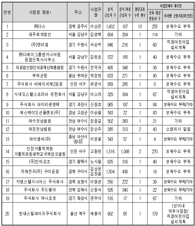 명단이 공표된 사업장은 다음과 같다. ㈜다스(경북 경주), 대주회계법인(서울 강남구), ㈜덴티움(경기 수원시), ㈜디에이그룹엔지니어링종합건축사사무소(서울 강남구), 의료법인 명인의료재단 화홍병원(경기 수원시), 부여군청(충남 부여군), ㈜비에이치 제2공장(인천 서구), 시네오스헬스코리아 유한회사(서울 강남구), ㈜아이티센엔텍(경기 과천시), 에스케이오션플랜트㈜(경남 고성군), 여수전남병원과 여천전남병원(전남 여수시), 와이엠씨㈜(충남 아산시), 인천가톨릭학원 가톨릭관동대 국제성모병원(인천 서구), ㈜인터로조(경기 평택시), 자화전자㈜ 구미공장(경북 구미시), 지멘스헬시니어스㈜(경북 포항시), ㈜푸드웨어(전북 김제시), ㈜하나로넷(경기 화성시), 현대스틸파이프㈜(울산 북구) 등이다.