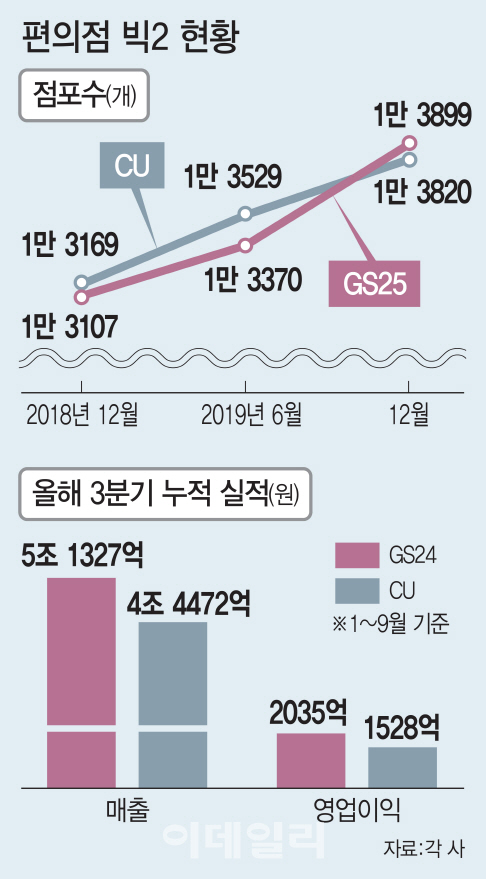 지난해 정보공개서 기준 가맹점별 단위 면적(3.3㎡) 당 매출은 GS25가 3129만원으로 경쟁사 CU보다 16.1%포인트(p) 높다. 올해 3분기 누적 매출액과 영업이익도 각 5조 1327억원, 2035억원으로 CU 4조 4472억원, 1528억원보다 우위를 차지하고 있다.