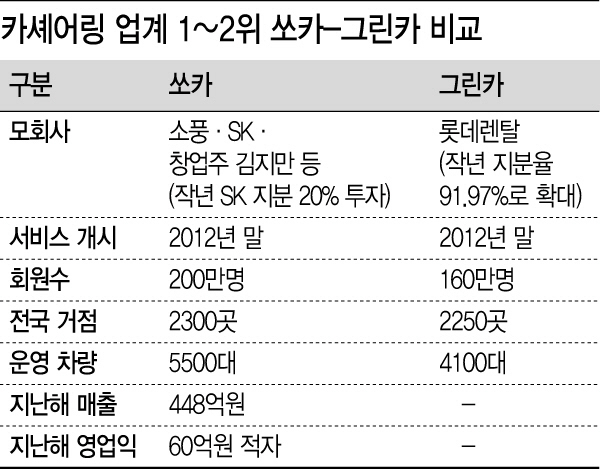 업계 2위 롯데렌탈의 카셰어링 자회사 그린카도 회원 수를 160만여명으로 늘렸다. 쏘카보다 회원 수는 적지만 2250개 거점에서 4100대의 차량을 서비스하는 등 인프라 면에선 크게 뒤지지 않는다.