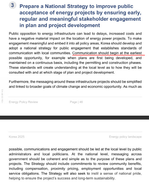 “한국은 지역 사회와의 소통 기준을 설정해 공공 참여를 하는 국가 전략을 개발하고 채택해야 한다. (주민 등과의) 소통은 가능한 가장 빠른 시점에 시작해야 한다. 예를 들어 계획이 처음 개발될 때부터 시작돼야 한다. 그리고 허가 및 건설 단계를 포함해 소통은 지속적으로 유지돼야 한다. 이러한 소통 기준은 지역 주민들이 어떻게 함께 의견을 나눌 수 있는지, 계획 및 프로젝트 개발의 어떤 단계에서 참여할 수 있는지를 이해하도록 할 것이다.”