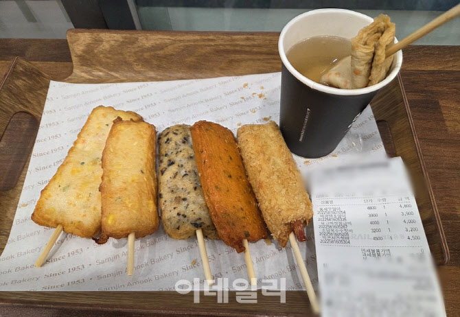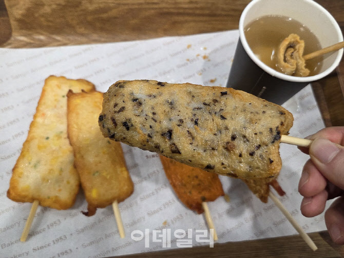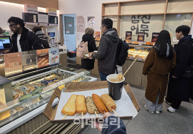 무엇이든 먹어보고 보고해 드립니다. 신제품뿐 아니라 다시 뜨는 제품도 좋습니다. 단순한 리뷰는 지양합니다. 왜 인기고, 왜 출시했는지 궁금증도 풀어드립니다. 껌부터 고급 식당 스테이크까지 가리지 않고 먹어볼 겁니다. 먹는 것이 있으면 어디든 갑니다. 제 월급을 사용하는 ‘내돈내산’ 후기입니다. <편집자주>  | | 어묵을 손에 든 외국인 관광객이 계산을 기다리는 모습. 삼진어묵 매장은 용산역 교통동선 한가운데 위치해 내외국인 방문이 잦다. (사진=한전진 기자) |