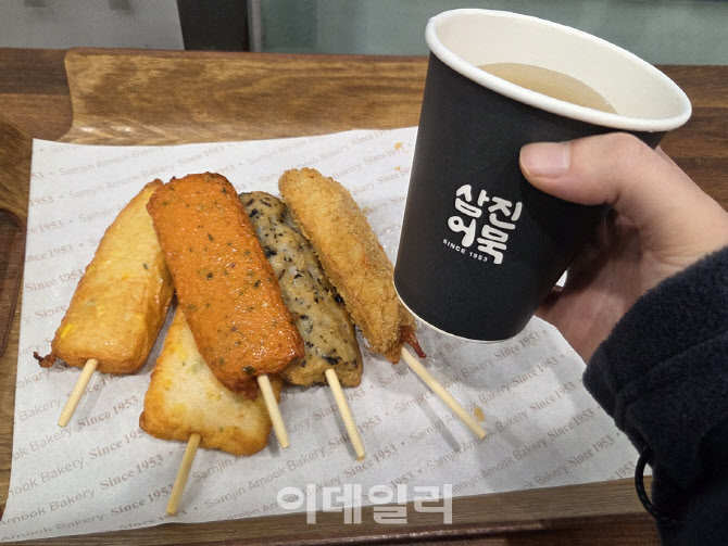 | | 삼진어묵의 인기 메뉴들과 어묵 국물. 추운 날씨에 따뜻하게 즐길 수 있는 구성. (사진=한전진 기자) |