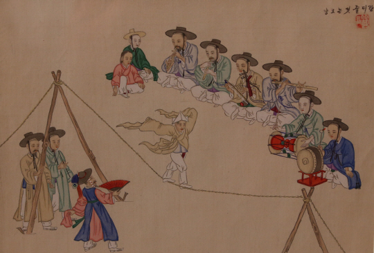 (서울=연합뉴스) 4일 오후 서울 종로구 사간동 갤러리 현대에서 열린 '옛사람의 삶과 풍류-조선시대 풍속화와 춘화' 전시회 기자간담회에서 공개된 기산 김준근 선생의 작품 '광대가 줄위를 걷는 모양'. 이번 전시회는 갤러리현대 본관과 두가헌갤러리에서 1월 15일부터 2월 24일까지 일반인에게 공개된다.