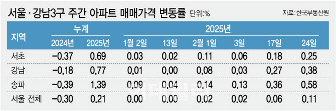 토허제 지정이 해제된 단지들은 일대 대장 단지를 중심으로 가격이 가파르게 치솟고 있다. 강남 대치동 래미안대치팰리스는 전용 84㎡ 기준 토허제 해제가 발표된 날 직전 거래보다 4억 5000만원이나 오른 40억원에 거래가 됐다. 잠실엘스의 경우 전용 84㎡ 기준 토허제 해제 직전 해제 기대감이 반영돼 28억 4000억원이 이미 신고가를 경신하기도 했다. 작년 말 기준 잠실엘스 전용 84㎡는 26억원~27억 7000만원대로 가격이 형성돼 있었다.