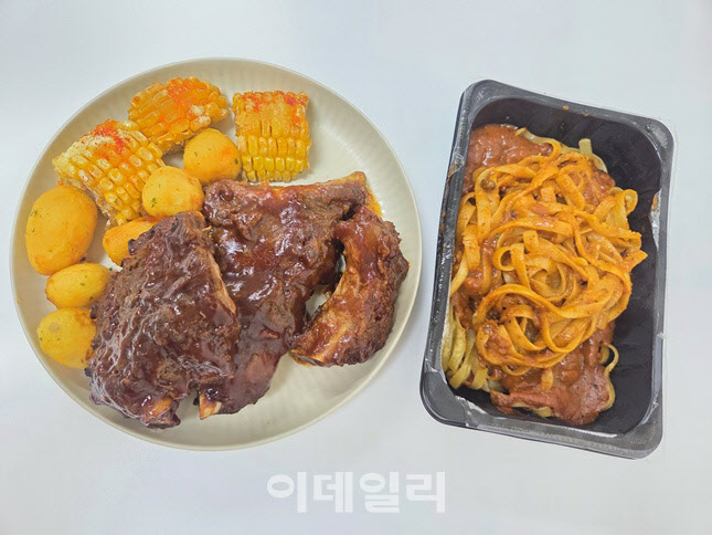 | | 큼직한 폭립과 감자·옥수수를 담은 플래터(왼쪽), 데워먹는 방식의 미트소스 파스타(오른쪽). 각각 5990원, 3990원 구성이다. (사진=한전진 기자) |